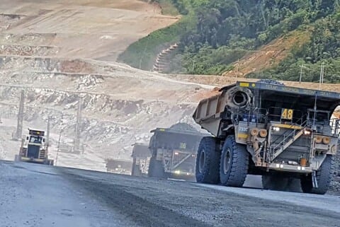 TAMBANG: Kendaraan berat memasuki kawasan pertambangan emas dan tembaga milik PT Amman Mineral di Sumbawa Barat, Nusa Tenggara Barat.--FOTO BERITASATU PHOTO/WHISNU BAGUS P.