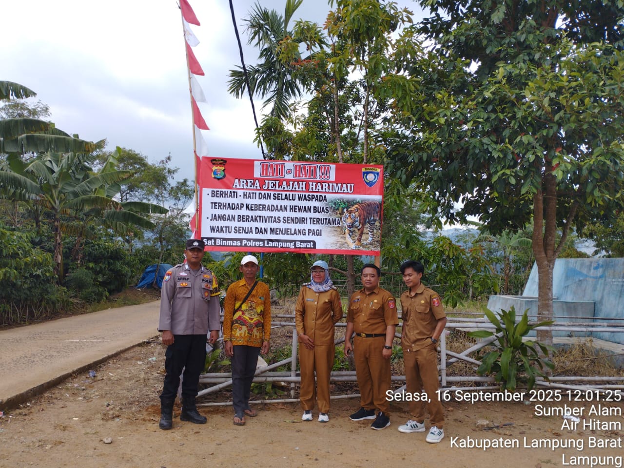 Pemasangan banner kali ini turut melibatkan aparatur pekon setempat yang dipimpin langsung oleh Penjabat (Pj.) Peratin Tri Wedarti Kehadiran aparat pekon dalam kegiatan ini menjadi bentuk sinergi antara pihak kepolisian dan pemerintahan desa dalam menjaga keselamatan warga dari ancaman satwa liar.
