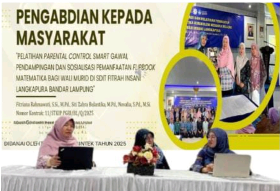 BANDARLAMPUNG-Didanai Direktorat Penelitian dan Pengabdian kepada Masyarakat Direktorat Jenderal Riset dan Pengembangan Kementerian Pendidikan Tinggi, Sains, dan Teknologi (Kemenristek Dikti), tim dosen STKIP PGRI Bandarlampung telah melakukan pengabdian kepada masyarakat (PKM) bagi wali murid dan guru SDIT Fitrah Insani Langkapura. PKM dalam bentuk pelatihan parental control smart gawai, pendampingan, dan sosialisasi pemanfaatan flipbook matematika ini diketuai Fitriana Rahmawati, S.Si., M.Pd. dengan anggota Siti Zahra Bulantika, M.Pd. dan Novalia, S.Pd., M.Si. serta mahasiswa yaitu Zeni Harisa dan Ryan Pratama.