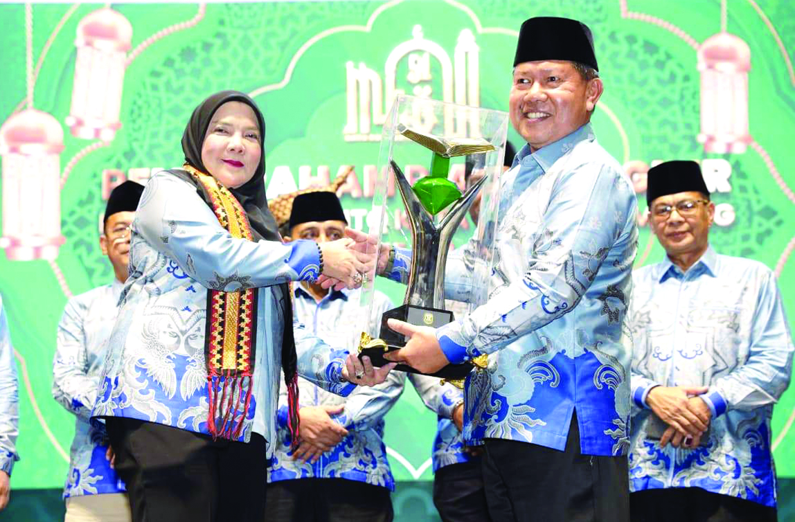 Wali Kota Eva Dwiana menyerahkan piala bergilir juara umum kepada Ketua LPTQ Kota Bandarlampung.-FOTO MELIDA ROHLITA/RADAR LAMPUNG -