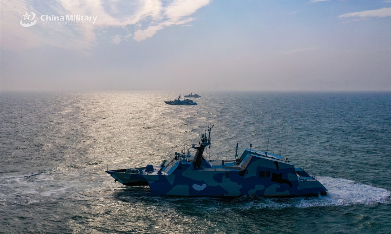 Sebuah kelompok kapal selam serang cepat yang tergabung dalam Angkatan Laut Tentara Pembebasan Rakyat Tiongkok (PLA Navy) berlayar di laut selama latihan militer maritim pada 5 April 2025.--FOTO WANG HEQIU-ENG.CHINAMIL.COM.CN