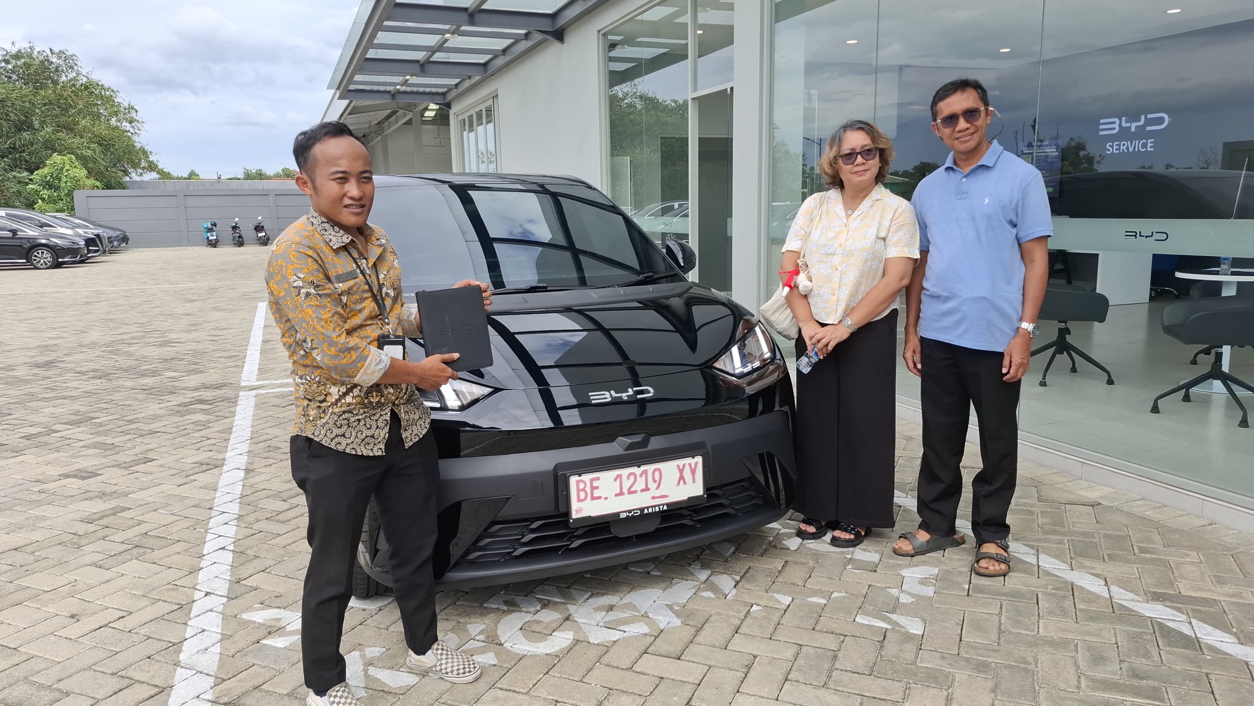 BANDARLAMPUNG - BYD Arista Lampung resmi memulai pendistribusian perdana unit Atto 1 ke tangan konsumen, Jumat (24/10). Proses serah-terima unit dilakukan di diler BYD Arista Lampung, Jl. Hi. Mena No. 98, Hajimena, Kecamatan Natar, Lampung Selatan.