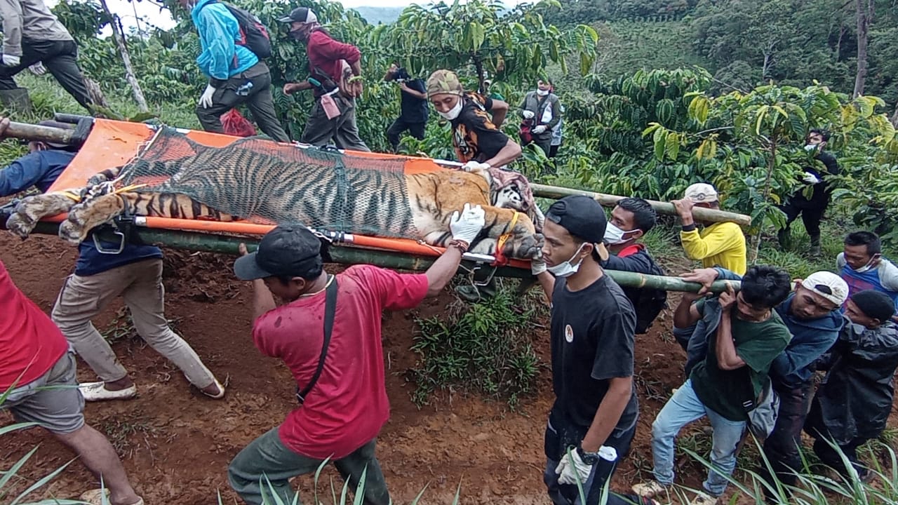 Setelah dipastikan dalam kondisi stabil, tim kedua bergerak membawa harimau menggunakan tandu menuju kendaraan roda empat yang telah dilengkapi sangkar besi milik BKSDA.
