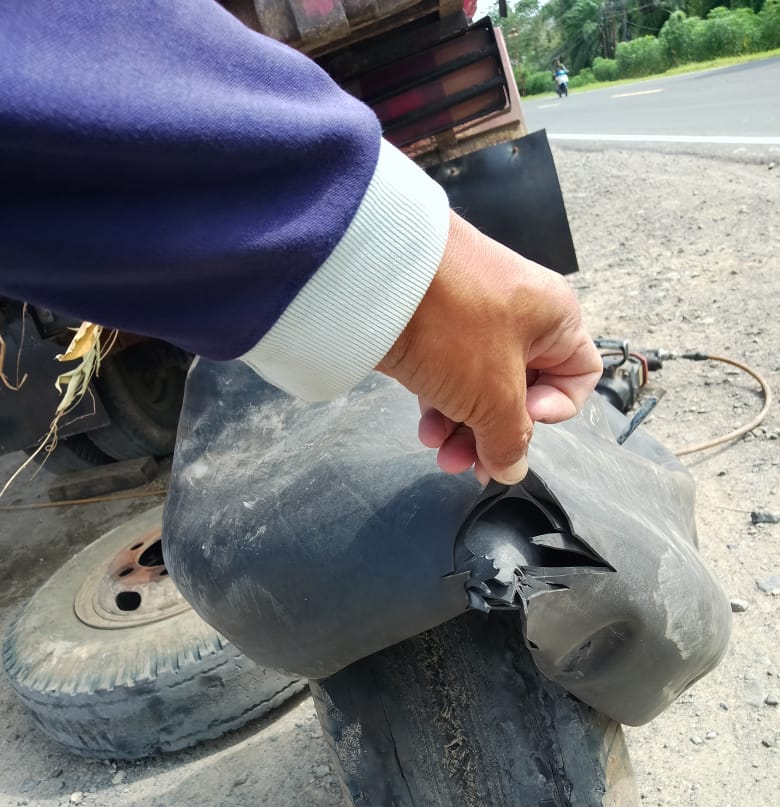 Dari dokumentasi yang diterima Radar Lampung, tampak sebuah truk sampah memaksakan diri menggunakan ban robek dan mengalami pecah ban dalam.