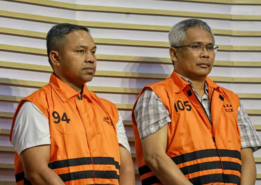 OTT: Gubernur Riau Abdul Wahid (kiri) dan Kepala Dinas PUPR-PKPP Riau M. Arief Setiawan (kanan) mengenakan rompi tahanan usai menjalani pemeriksaan di Gedung Merah Putih. -FOTO BERITASATU -